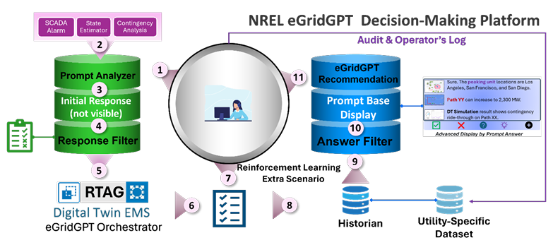As the operational ‘brain’ of the grid, operators play a critical role in balancing supply and demand to maintain grid reliability in real time. Like the human brain processes sensory input to make decisions, NREL’s eGridGPT is designed to assist power grid control room operators virtually. It enhances decision-making by interpreting complex data and models, providing valuable support to ensure the grid remains stable and responsive.